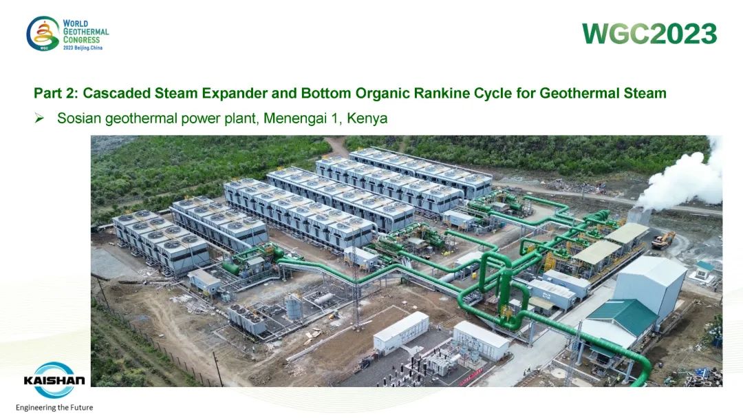 湯炎博士著重介紹了由開山EPC建設(shè)的肯尼亞Sosian-Menengai地?zé)犭娬炯伴_山自主開發(fā)、建設(shè)、運營的Sorik Marapi地?zé)犭娬境晒Π咐osian-Menengai地?zé)犭娬静捎谩罢羝蛎洐C(jī)+濕蒸汽ORC膨脹機(jī)”模塊電站串級循環(huán),無需采用傳統(tǒng)中央電站分離不凝性氣體的蒸汽噴射器和真空泵,從而降低了電站寄生負(fù)荷、提高其發(fā)電效率。Sorik Marapi項目是公司各類型模塊電站的集大成者,高壓蒸汽井、低壓蒸汽井、熱水井熱源均可得到充分利用,進(jìn)而使項目實現(xiàn)“無閑置低壓/低溫井”。模塊電站“量體裁衣”式的解決方案通過提高井熱效率改善了地?zé)衢_發(fā)的經(jīng)濟(jì)性,也通過獨樹一幟地有效利用低壓地?zé)峋盁崴@著降低了資源鉆探的單位成本。