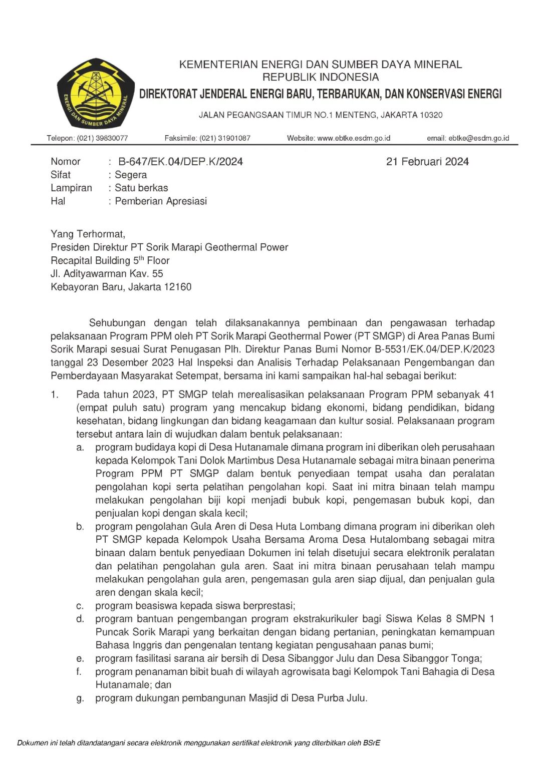 開山資訊|SMGP地熱電站收到印尼能礦部地熱處長簽署的感謝信