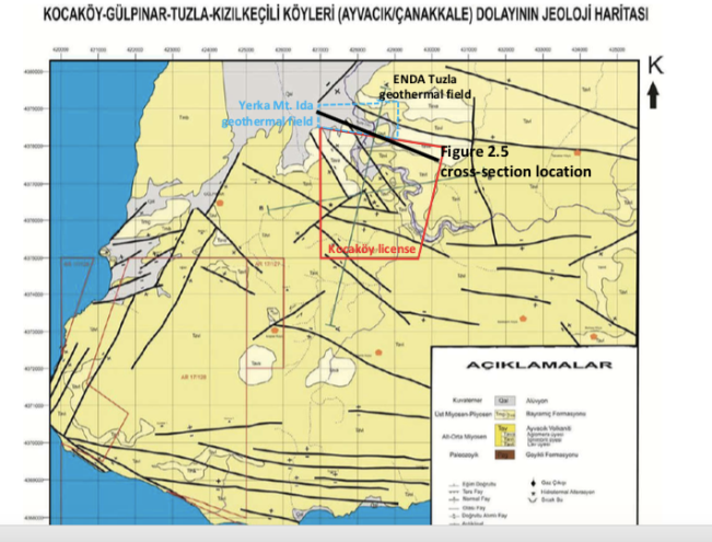 Transmark GPP項目位于Biga半島;北安塔利亞斷裂區(qū)南段、Kestanbol斷層系統(tǒng)的移動主導(dǎo)了區(qū)域內(nèi)由地?zé)峤Y(jié)構(gòu)控制的滲透性,建立深層、高溫的地?zé)崃黧w帶至淺層的熱循環(huán)。項目所在的恰納卡萊省有超過5個投運(yùn)和開發(fā)中的地?zé)犴椖俊?/span>